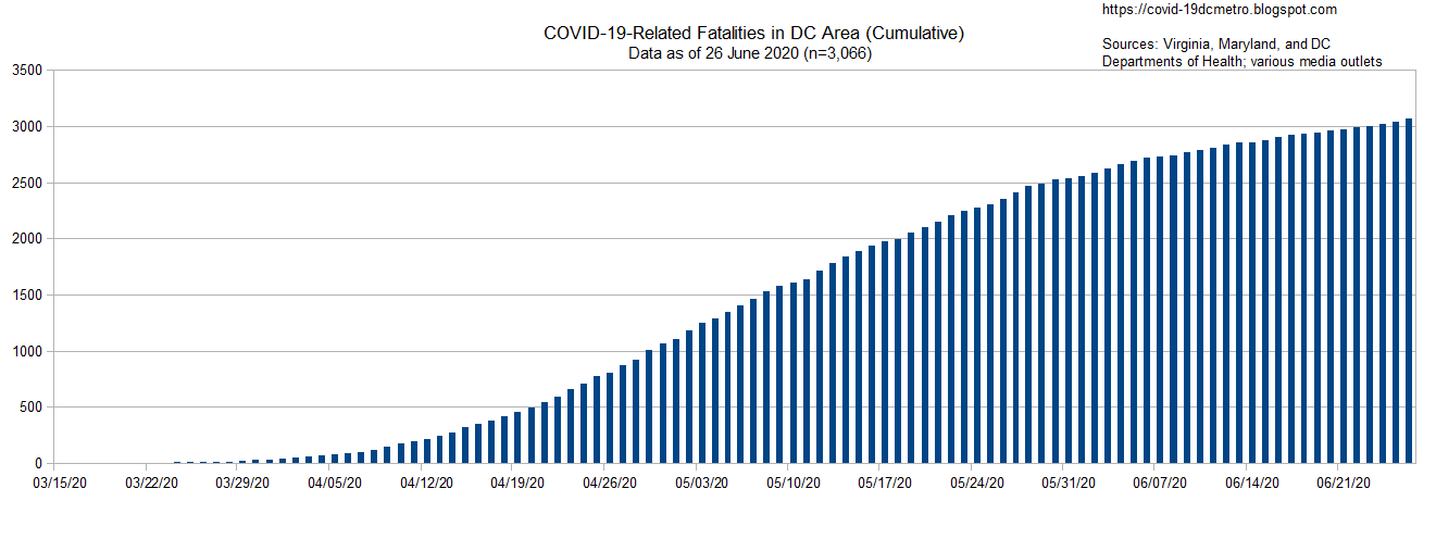 This post updates COVID-19 confirmed case data for the DC Metropolitan area as of June 26th 2020. The total confirmed cases in the DC area rose by 371 to 78,024 from the previous total of 77,653, an approximate <1% increase. Fatalities rose by 27 to 3,066 from the previous total of 3,039, an approximate 1% increase.
